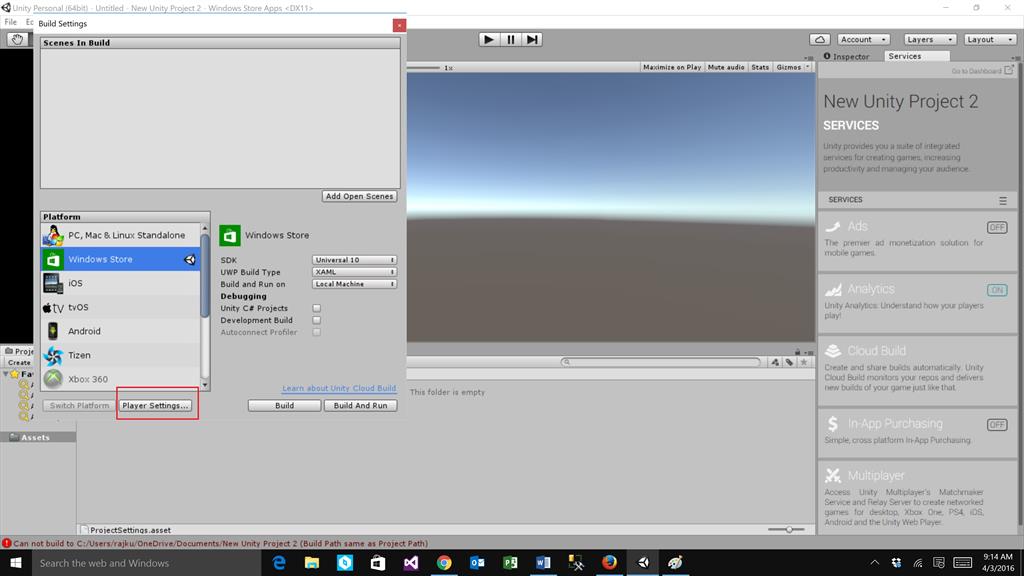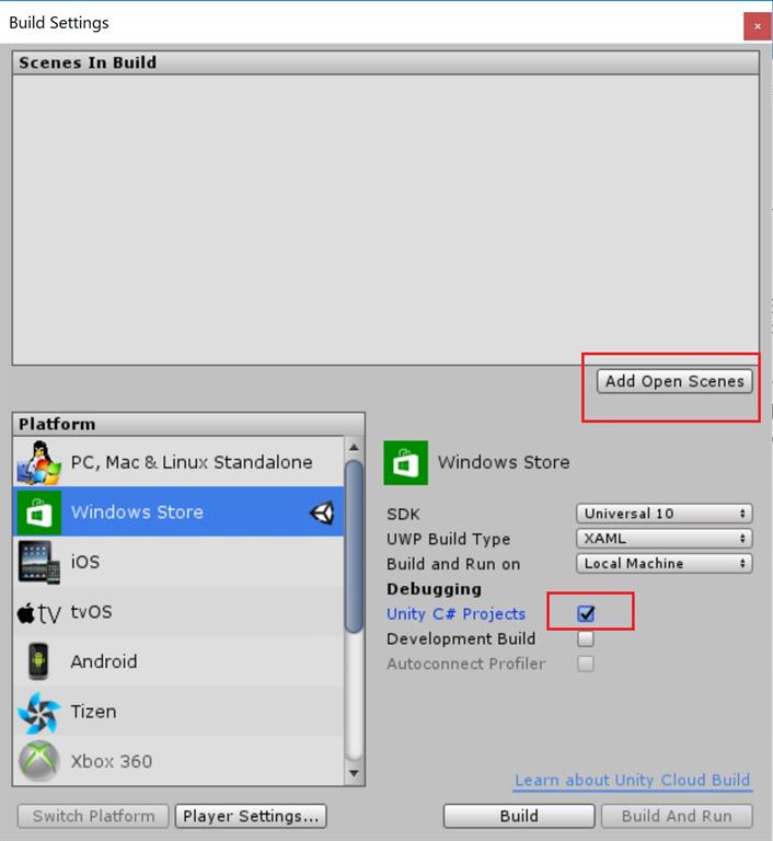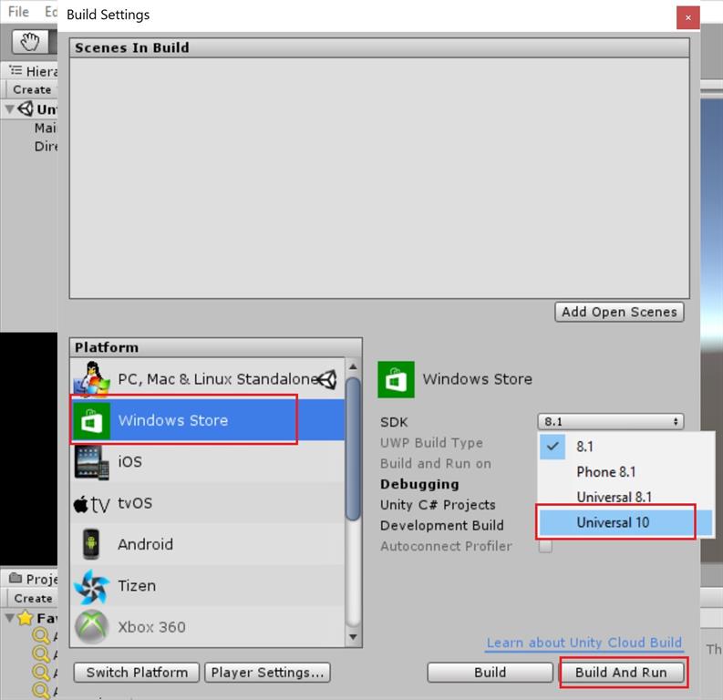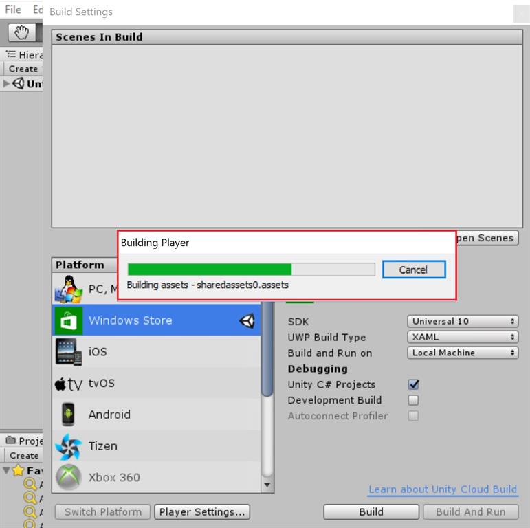 We want to specify our Unity project to export as a Universal Windows Platform app.