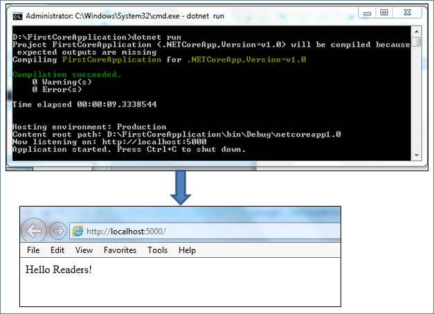 The "dotnet run" command runs the project in the current directory and the hosted Application on default 5000 port.