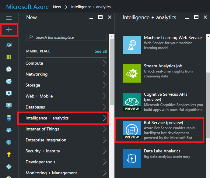 From Azure Management Portal, click New and then Intelligence + analytics. Subsequently, click Bot Service (Preview).