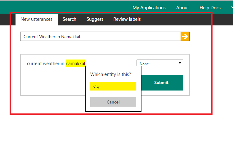 Now, create new entities by providing an entity name and click save. Now, create an intent and click save button, as shown below. Now, add new utterances, select city name and mark it as city and save it in weather intent and click save button.