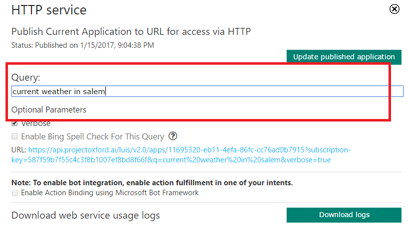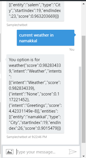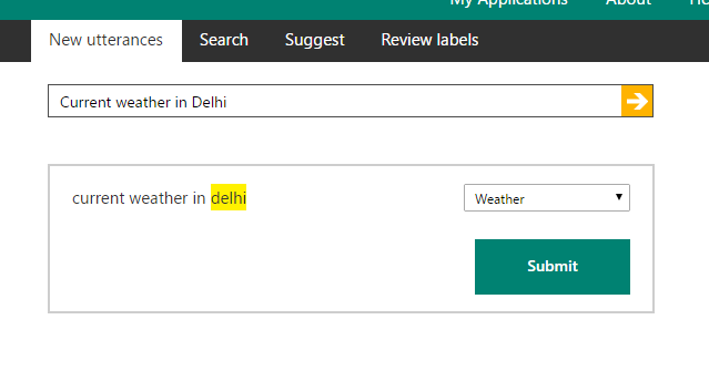 Once changes are published, query the LUIS Application by using saved utterances and click enter, as shown below and the output given below confirms that our application starts working as expected.