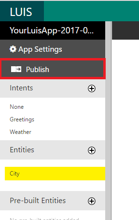 Everything was done. Click publish button, as shown below. Now, click Train option, which is available under the LUIS Application Window. Once training completes, you will be able to find Publish button, as shown below.