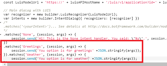 - .matches('Weather', (session, args) => { session.send('You option is for weather' +JSON.stringify(args));