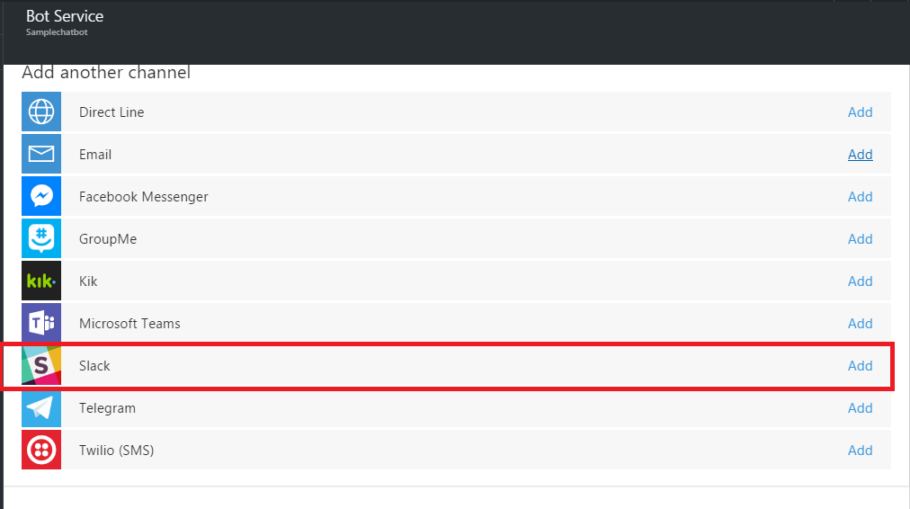Now, click on the channels option, which is made available in bot application. Scroll down, find Slack and click on it to start configuring bot with Slack.