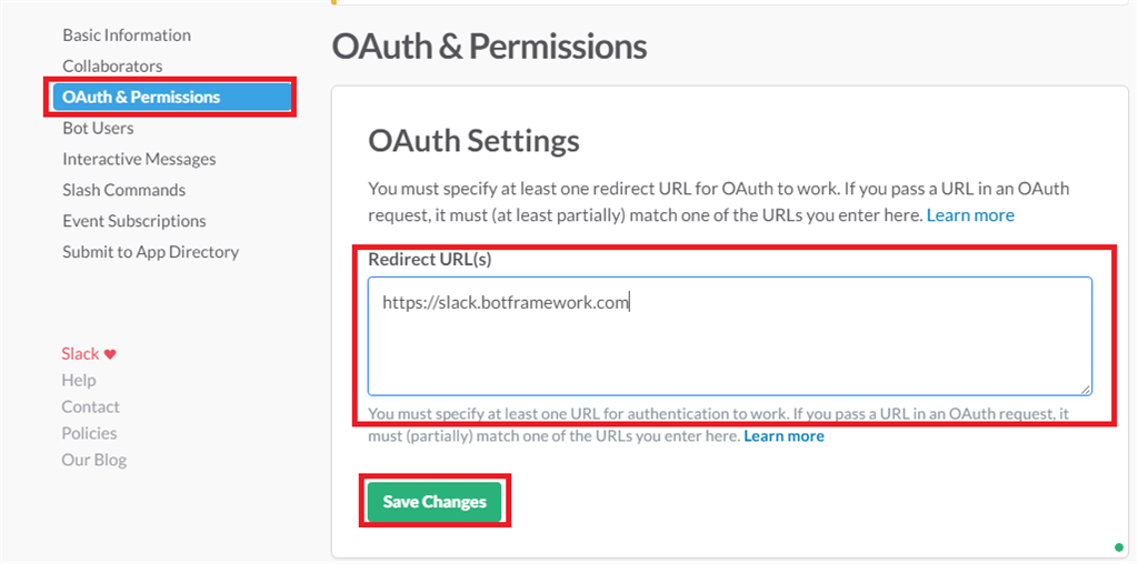 Now, click on OAuth&permission option and add the redirected URL given below and click save button. Redirect URL must be https://slack.botframework.com and click save button.