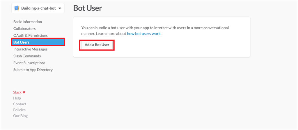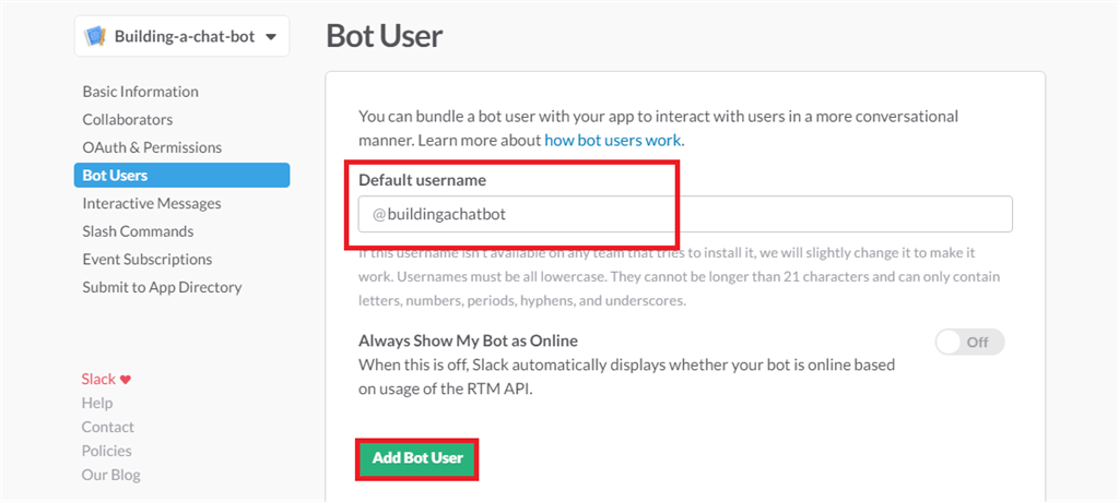 Now, elect ‘Bot Users’ tab and add a bot to your app. You will find the default username and click Add bot to add the user to your bot Application.