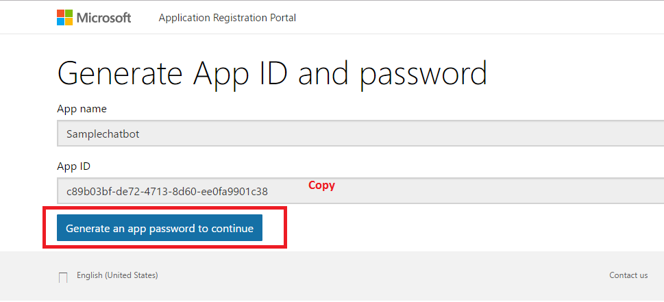In order to work with a bot, we need to register an application with app ID and password. To register bot Service, click “Create Microsoft App ID and Password”. Now, you will be landed in the Application registration portal. Now, you will be able to find an app name and app ID. To generate a password, click “Generate an app password to continue”. Before clicking my opinion, copy and paste an app Id in Notepad because it is used in future. Now, a popup appears in it, copy app password and paste it in Notepad. Subsequently, click OK and subsequently click Finish. Go back to bot Service framework.