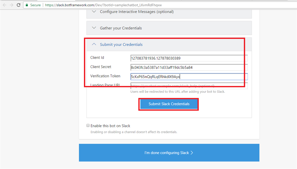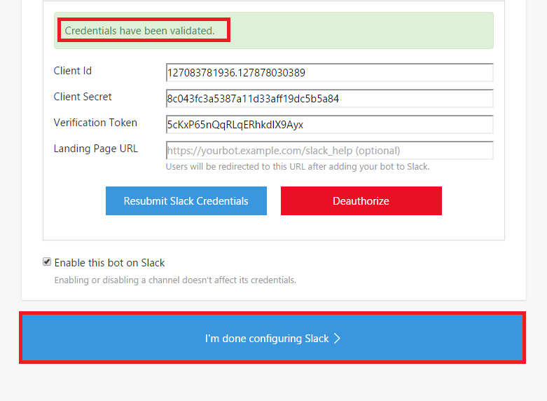 Again, you will be navigated to Slack configuration page. In it, enable this bot on the Slack option and then click I’m done configuring Slack.
