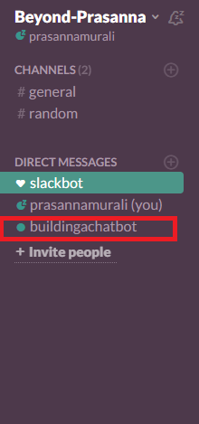 To check whether the bot is working correctly, now open up Slack and log in to your Slack team, where you will be able to find your bot Service, which is configured.