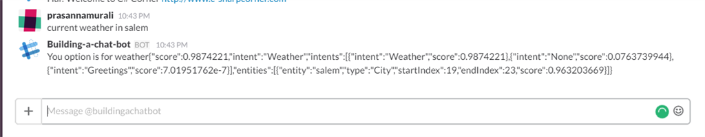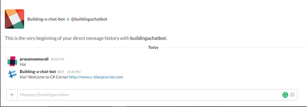 In this article, we discussed creating a simple bot and connecting bot applications with slack. I hope, you enjoyed reading this article. Thanks for reading.