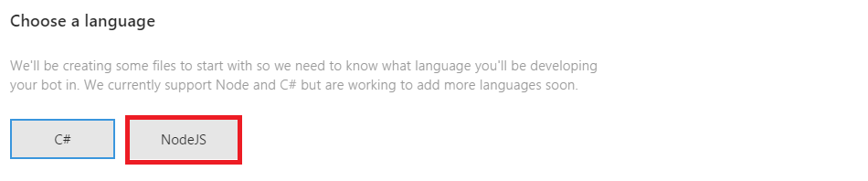 In bot Service page, paste app Id and app password, which is already copied from the application registration portal. If successful, choose language as Node.js.