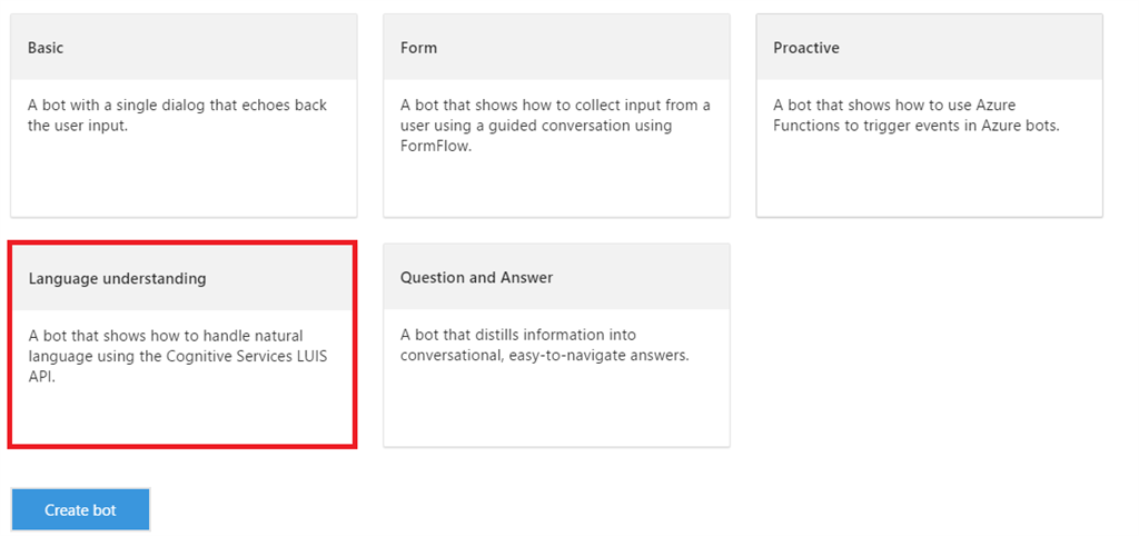 It is mandatory to select bot Service Application template. In it, select the template as per your needs. Here, we are going to select “language understanding” and click Create bot to create a bot Service in Azure.
