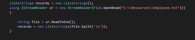 - using (StreamReader sr = new StreamReader(File.OpenRead("C:\\Resources\\Employee.txt")))