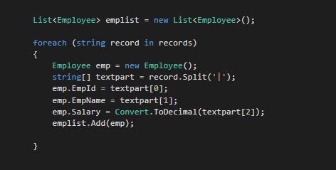 - emp.Salary = Convert.ToDecimal(textpart[2]);