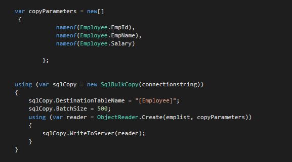 Here, I am creating a SQLBulkCopy Object. I am using the FastMember ObjectReader class, which creates a DBDataReader object by taking 2 parameters, my employee object list and the type of employee object members. In return, the ObjectReader creates a DBDataReader object, which I can pass in SQLBulkCopy.WriteToServer method.