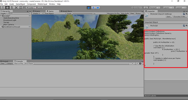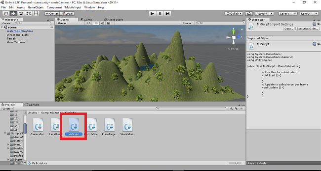 First, you have to open the Unity project. Create terrain, trees, and water. Add skyboxes in your project. Create C# scripts and rename the script as MyScript.
