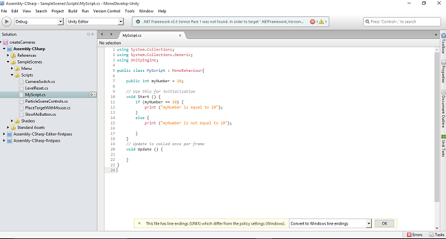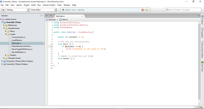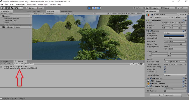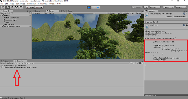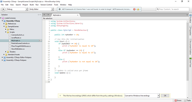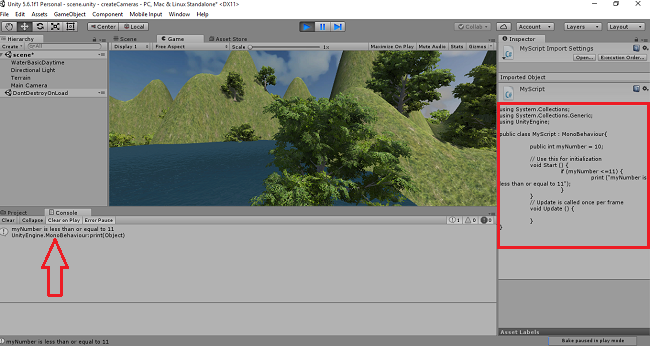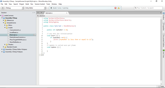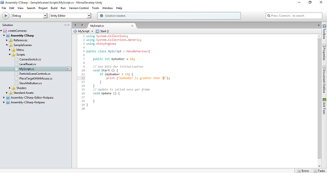 Go back to the Unity window. Click on the “Play” button. Nothing will be displayed in the console because the value is not greater than 10.