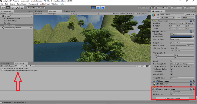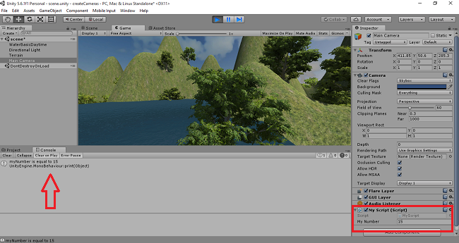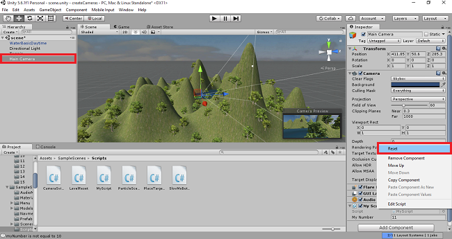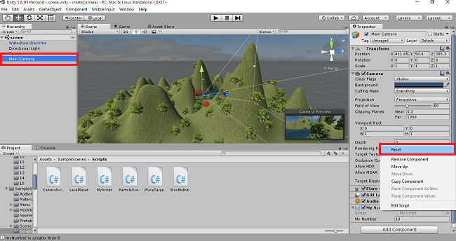 Go back to the Unity window. Click on the Main camera. Select "My Script" and click on the Reset option.