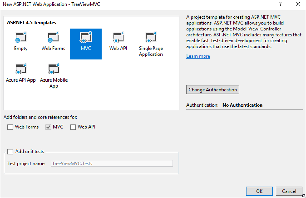 Step 3Select “MVC project template” from the ASP.NET Template Wizard to create MVC app.