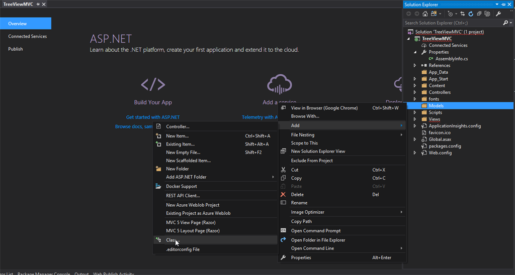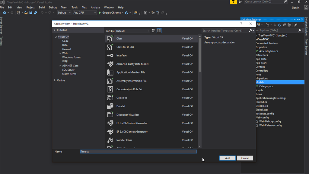 From soulotion explorer window, right click on Models folder ->add ->class and let's name it "Tree"