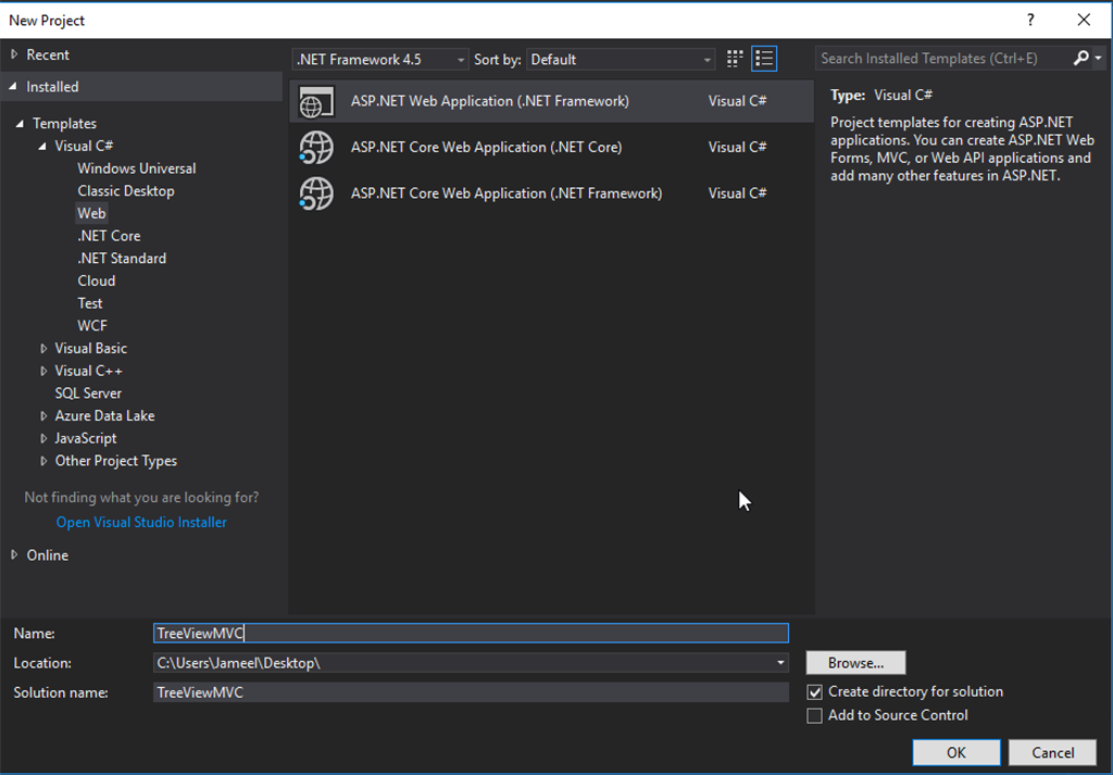 Select "Web" tab from the left panel and select the “ASP.NET Web Application”.