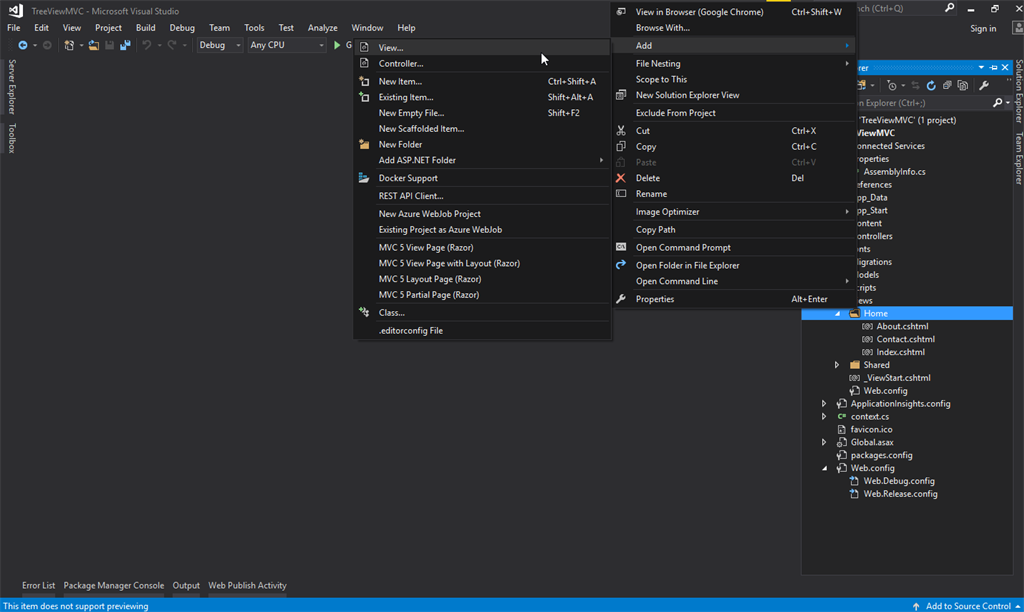 From Solution Explorer window, expand the Views folder and right click on Home folder to add an Empty View, and name it "TreeView".