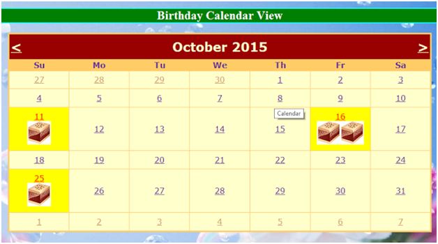 - <h2 style="text-align:center;border:2px solid aqua;background-color:green;color:white">Birthday Calendar View</h2>