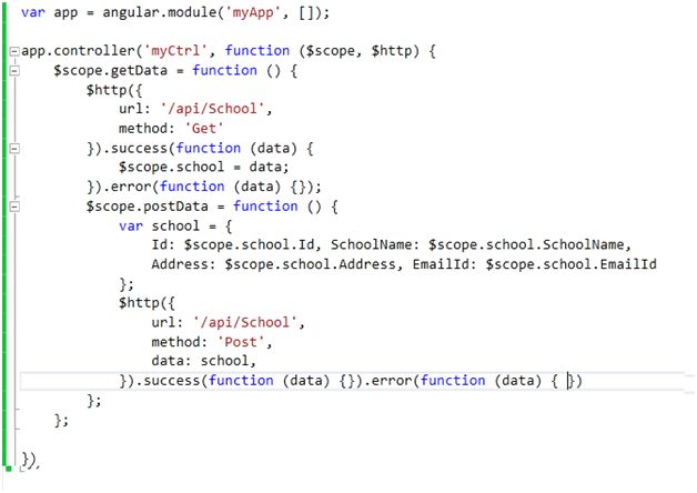 Create a module and a controller. In the controller, we inject $http service, which is used to pass and retrieve the data from Web API. In this controller, we will create two functions, getData and postData.