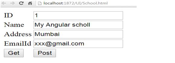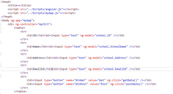Step 6 Create a School.html page and in this page, take reference of Angular.js file and my script file and two buttons, where one is for Get and another for Post.
