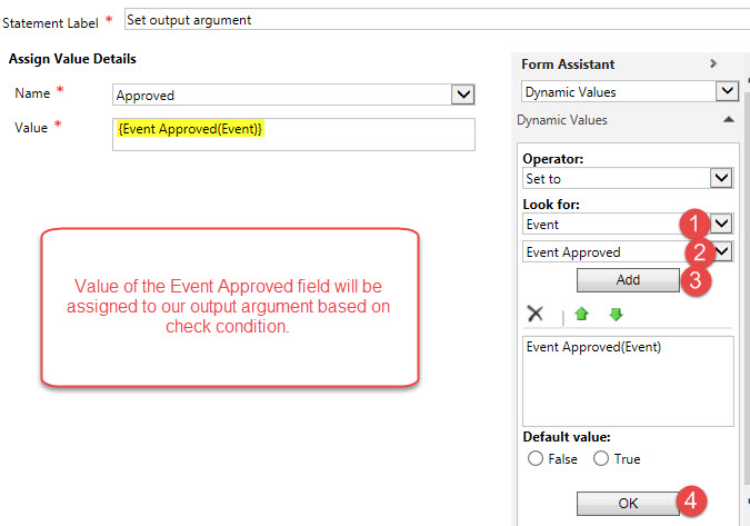 12. Now add an Assign Value step outside of if condition scope and assign Event Approved field value to output argument like the following screenshot: