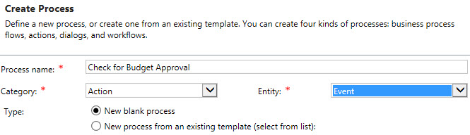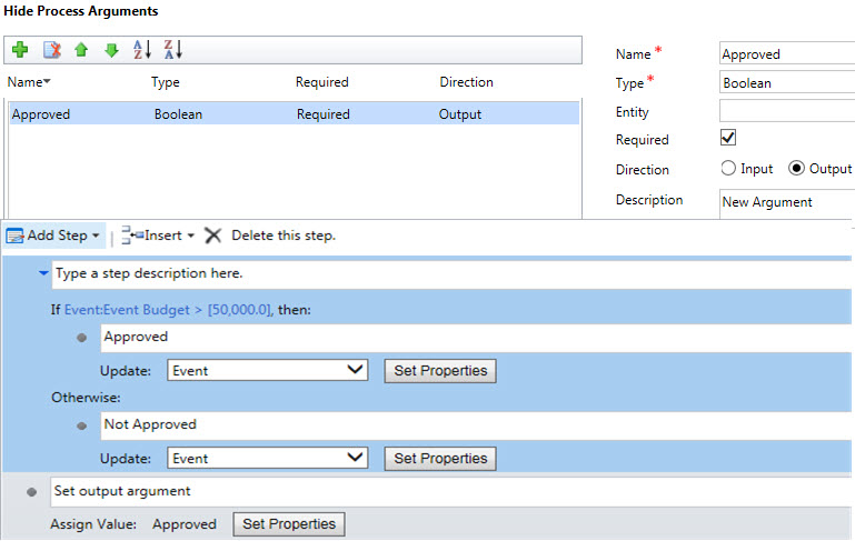 Let’s take a scenario that we want to design one action for our custom event entity to approve an event based on its budget field value, for example, if the budget is more than 50,000 then it will be approved, otherwise not. This action will have only one output parameter, which will return true or false based on if the event is approved or not. So let’s design our action first, usingthe following steps: