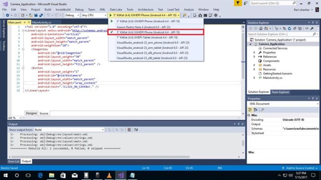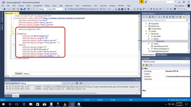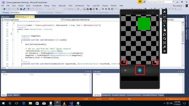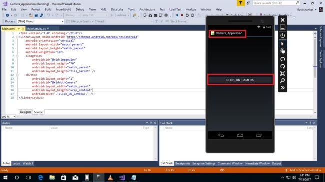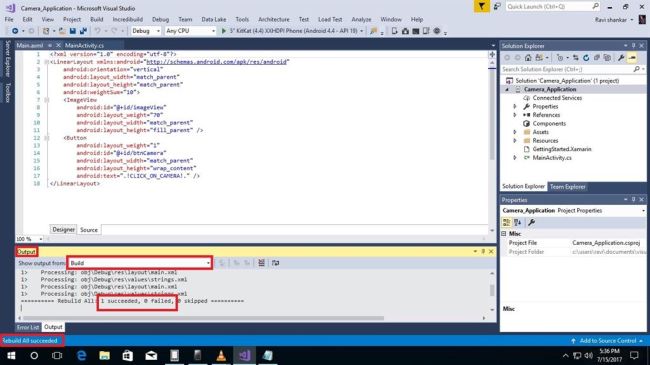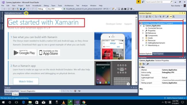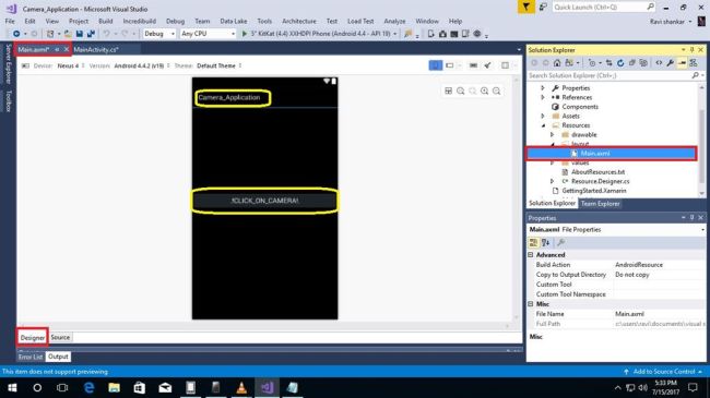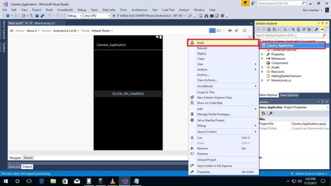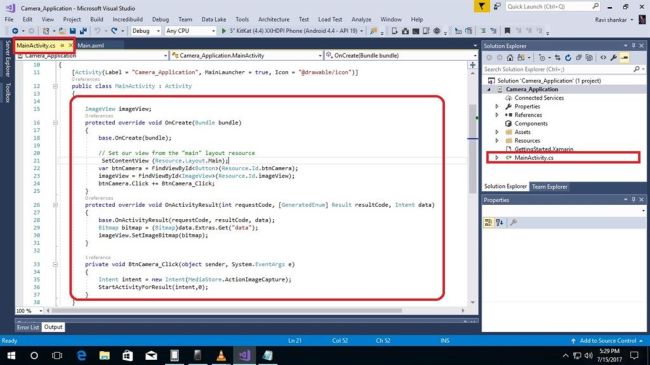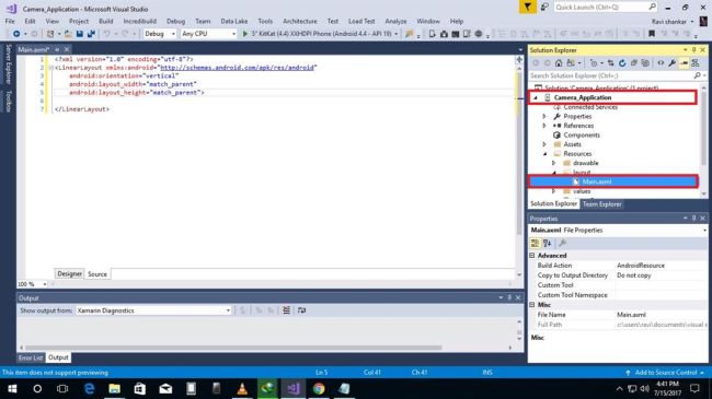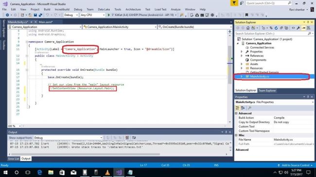 Double click on MainActivity.cs file. You will see the camera application. Protected override content including a file of //SetContentView (resource.layout.Main) should be there.