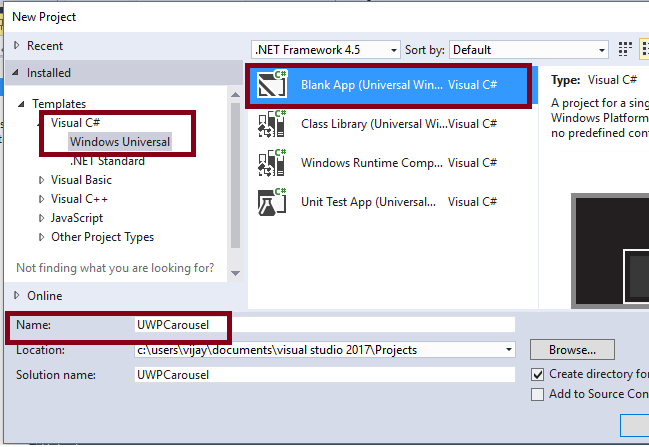 Open Visual Studio 2017 and go to Start -> New Project-> select Windows Universal (under Visual C#)-> Blank App (Universal Windows) -> give it a suitable name (ex- UWPCarousel)->OK.