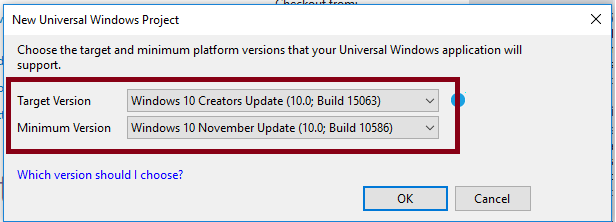 After choosing the target and minimum platform version that your Windows Universal application will support, the Project creates App.xaml and MainPage.xaml.