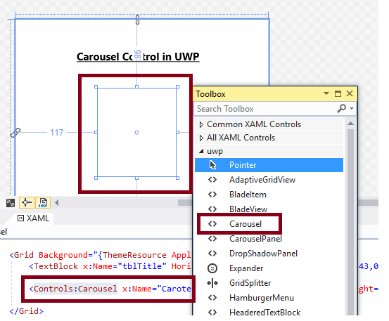 Add the Carousel Control and change the Name, InvertPositive, ItemDepth, ItemMargin, ItemRotationX, ItemRotationY, ItemRotationZ,Orientation, ItemTemplate, SelectedIndex, Margin, EasingFunction Properties.