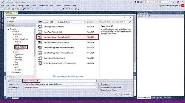 Open Visual Studio 2015. Go to Start -> New Project-> select Cross-Platform (under Visual C#-> Blank App (Xamarin.Forms Portable)-> Give a suitable name for your app (XamFormCarousel) ->OK.
