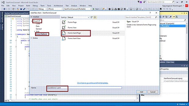 Add 4 XAML pages (CaroDemo1, CarouselPage Demo), right click the project, select ADD-> NewItem