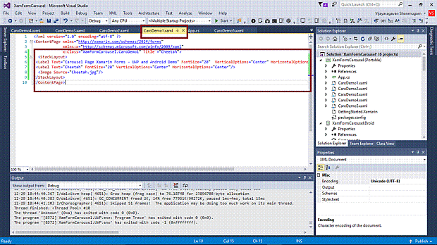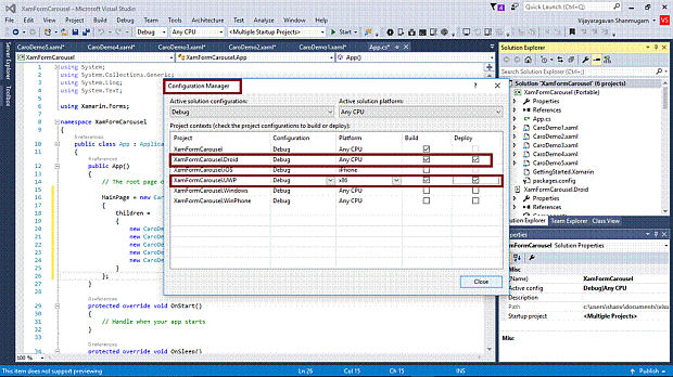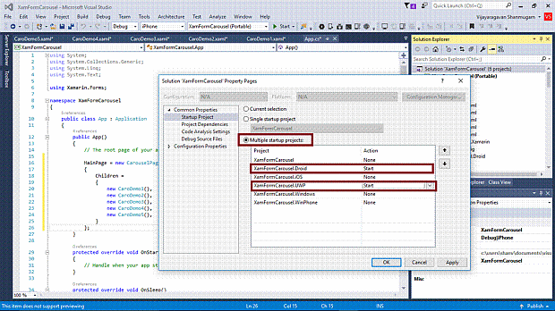 We will test Android and UWP. So, we need to set multiple startup projects as XamFormCarousel.Droid and XamFormCarousel.UWP (Universal Windows).