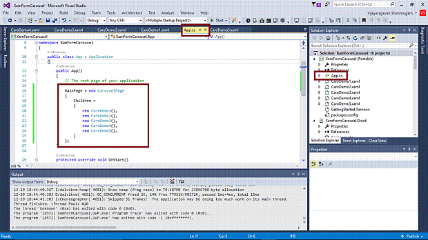 Open (double click) the file App.cs in the Solution Explorer-> XamFormCarousel(portable) and set the root page as Carousel Page with children pages.
