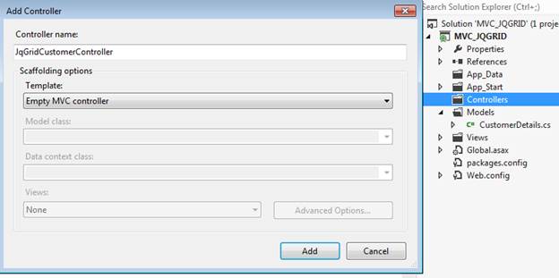 - Add Controller (jqGridCustomer) to the project. The control is the starting point in MVC Application. It contains the actions to Get/Post the data and display, using view.