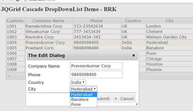 - Select the particular row and click Edit icon and you can edit the selected items. Here, the country and city are shown as dropdownlist and the cities will change, based on the country selection.