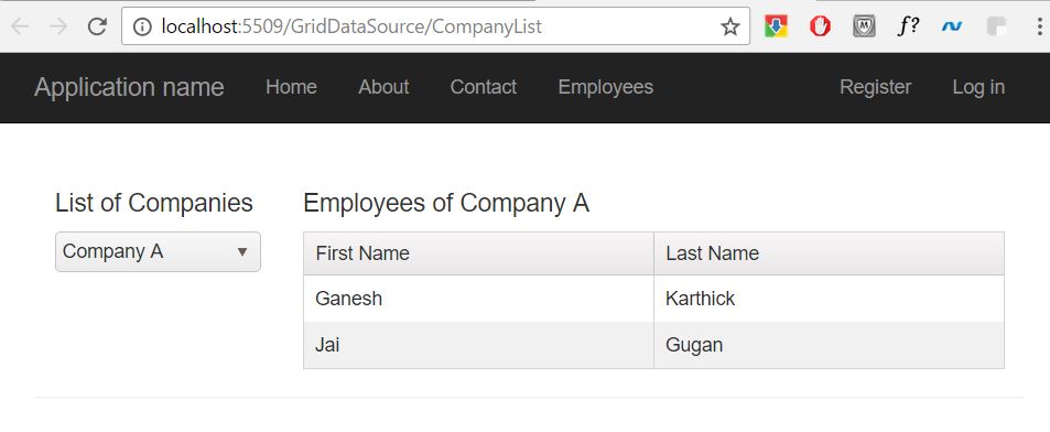 From the code, shown above, you can notice that Kendo DropDownList is implemented with the change event. In the change event function definition, we are going to change Kendo Grid datasource, based on the company selection. If company A is selected, the employee of company A will be populated in the Kendo Grid, else, if the company B is selected, the employee of the company B will be populated in Kendo Grid.
