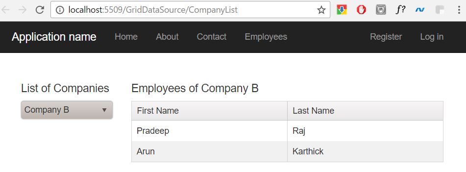 Selecting company B from the dropdownlist of the employees of company B will be populated in the Grid.