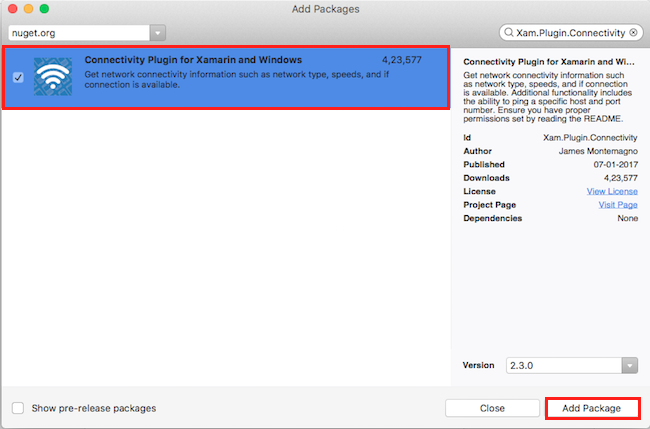 Now, choose Xam.Plugin.Connectivity and select Version. Afterwards, click Add Package.
