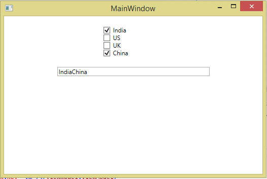Here ‘Name’ property is used to store the selected countries' names, as shown in the single string. When the user selects any country, we concat the checkbox name in this ‘Name’ property and when it is unchecked, we remove this name from the string. Finally, we bind this property ‘Name’ to the text box.