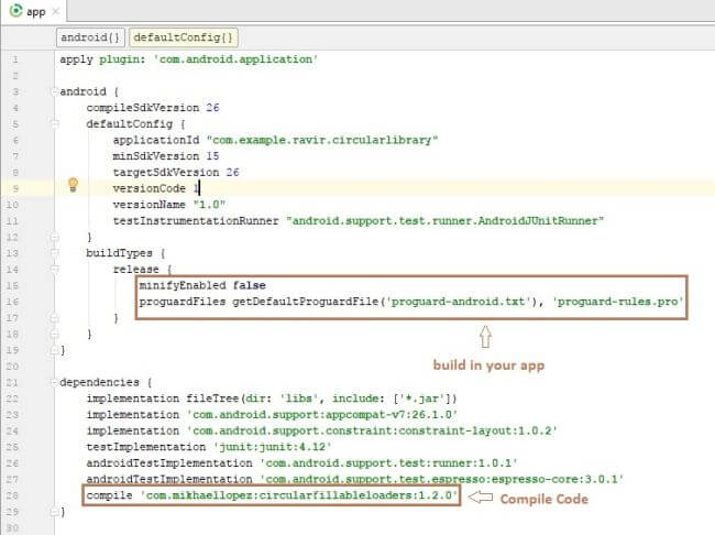 Select build.gradle (Module:app). The app gradle compile code and buildTypes will appear. Just replace that the following code. To make a circular fillable loader add Circular Fillable Loader in your layout XML and add Circular Fillable Loader library in your project or you can also grab it via Gradle.