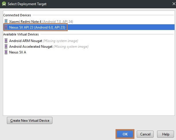 Next, go to Android Studio and Deploy the application, Select Emulator or your Android mobile with USB debugging enabled. Give it a few sec to make installations and set permission.