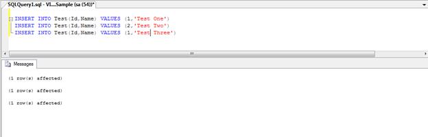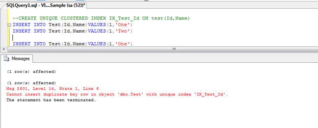 After creating unique cluster index, we cannot insert duplicate values in table which field created unique index. First, we insert two records into “Test” table. Then, when we again insert the same Id into table, we get the error as in the below screenshot.