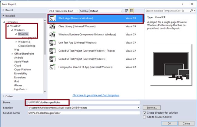 Open Visual studio 2015 -> Start -> New Project-> Select Universal (under Visual C#->Windows)-> Blank App -> Give the Suitable Name for your App (UWPC4FColorHexagenPicker)->OK.