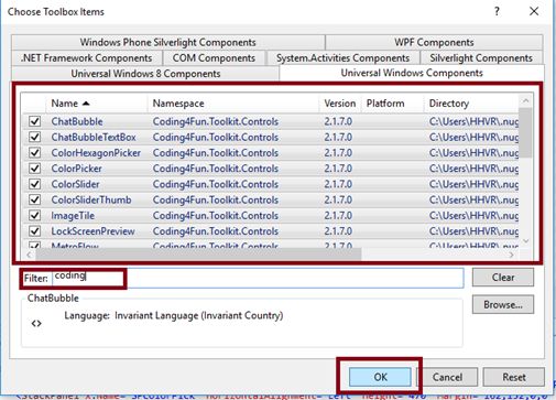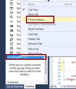 Right click the Coding4Fun Kit (Newly added tab) and Select choose items